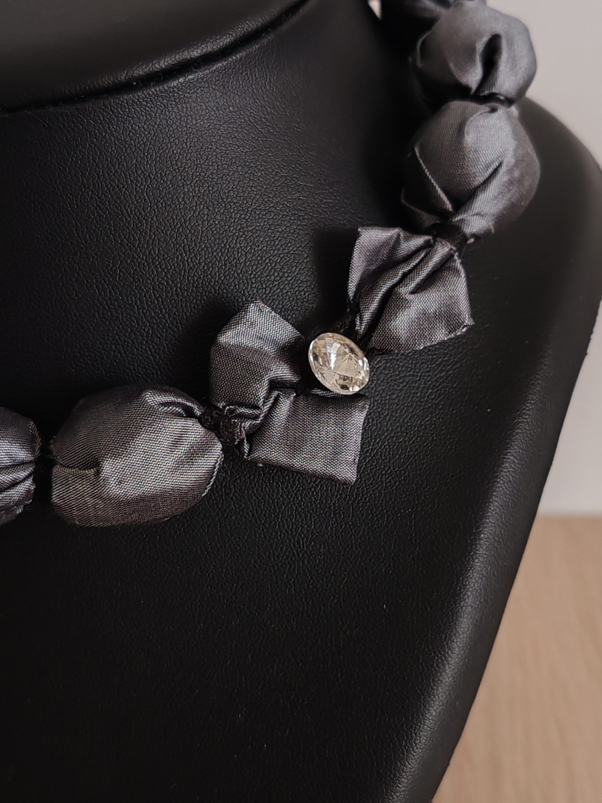 Très joli et élégant collier en soie grise, et se ferme grâce à un bouton strass;