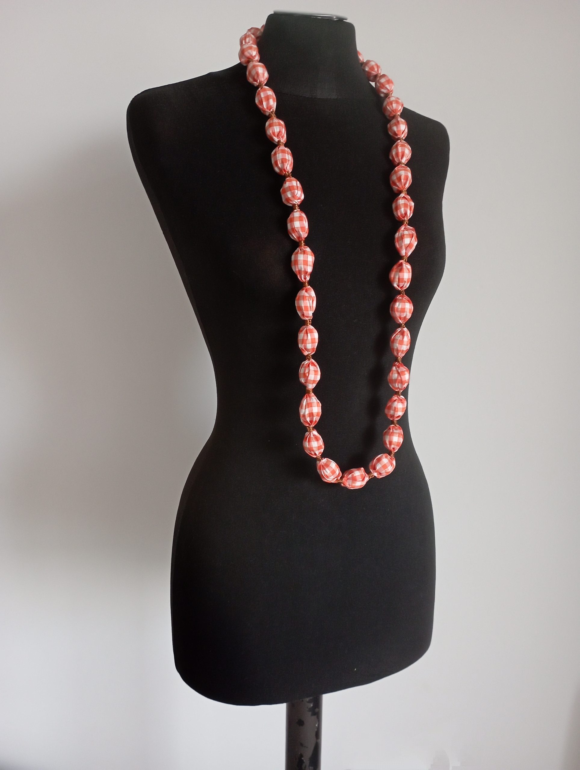 Magnifique collier sautoir ceinture en perles enrobées de tissus en soie tissage vichy orange et blanc et sertie de fil de lurex cuivre