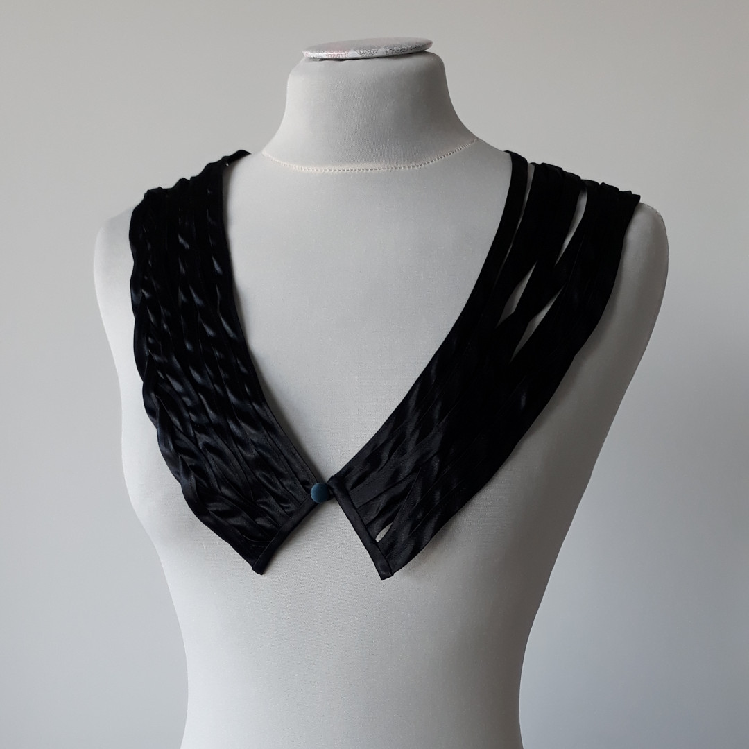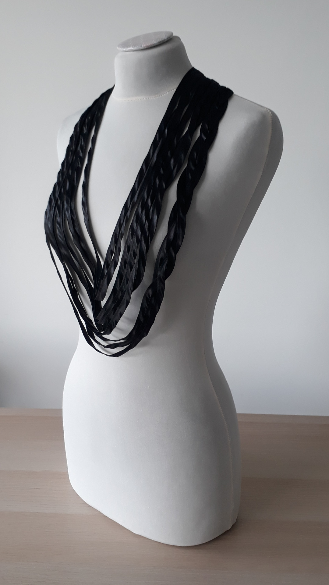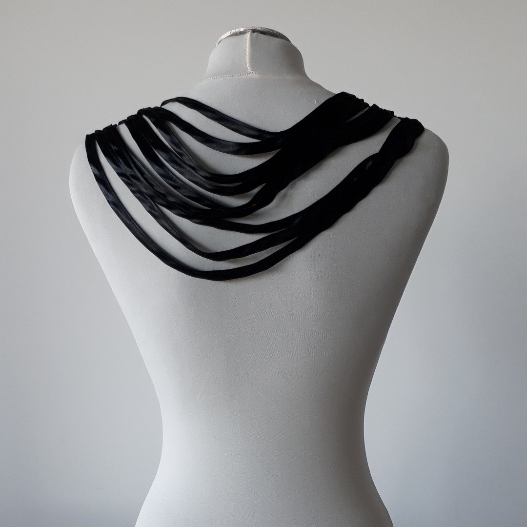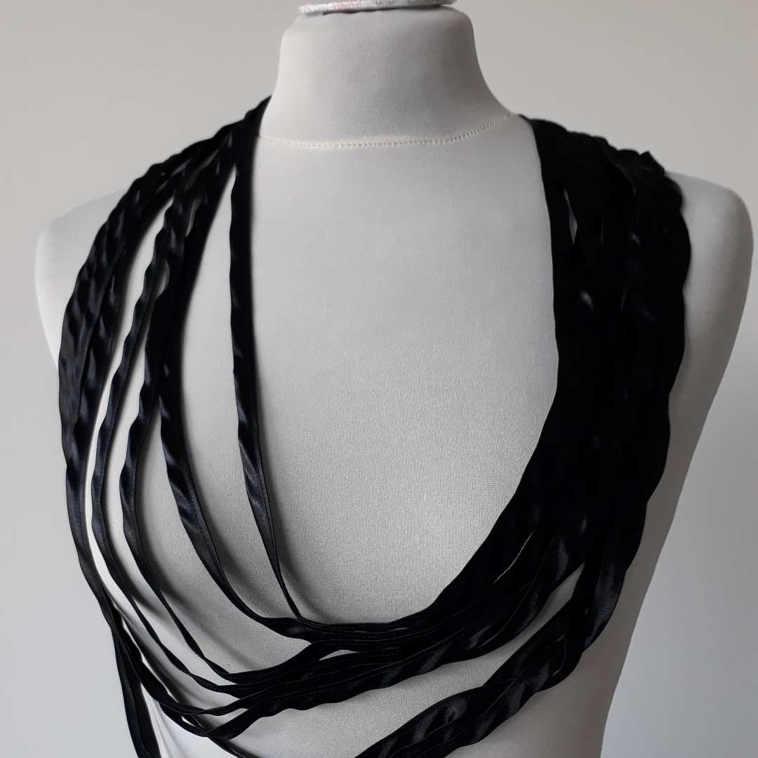 Collier sautoir en tissus, 100 % rayonne noir satin 10 rangs asymétrique,parfois tressés… Se porte en col devant-derrière… Et comme collier, châle de différentes manières. C’est à vous de le poser de la façon dont il vous que vous souhaitez… Sur tous vos décolletés… Vos cols roulés, et chemisiers… Ce joli accessoire se ferme grâce un petit bouton vert et une bride…