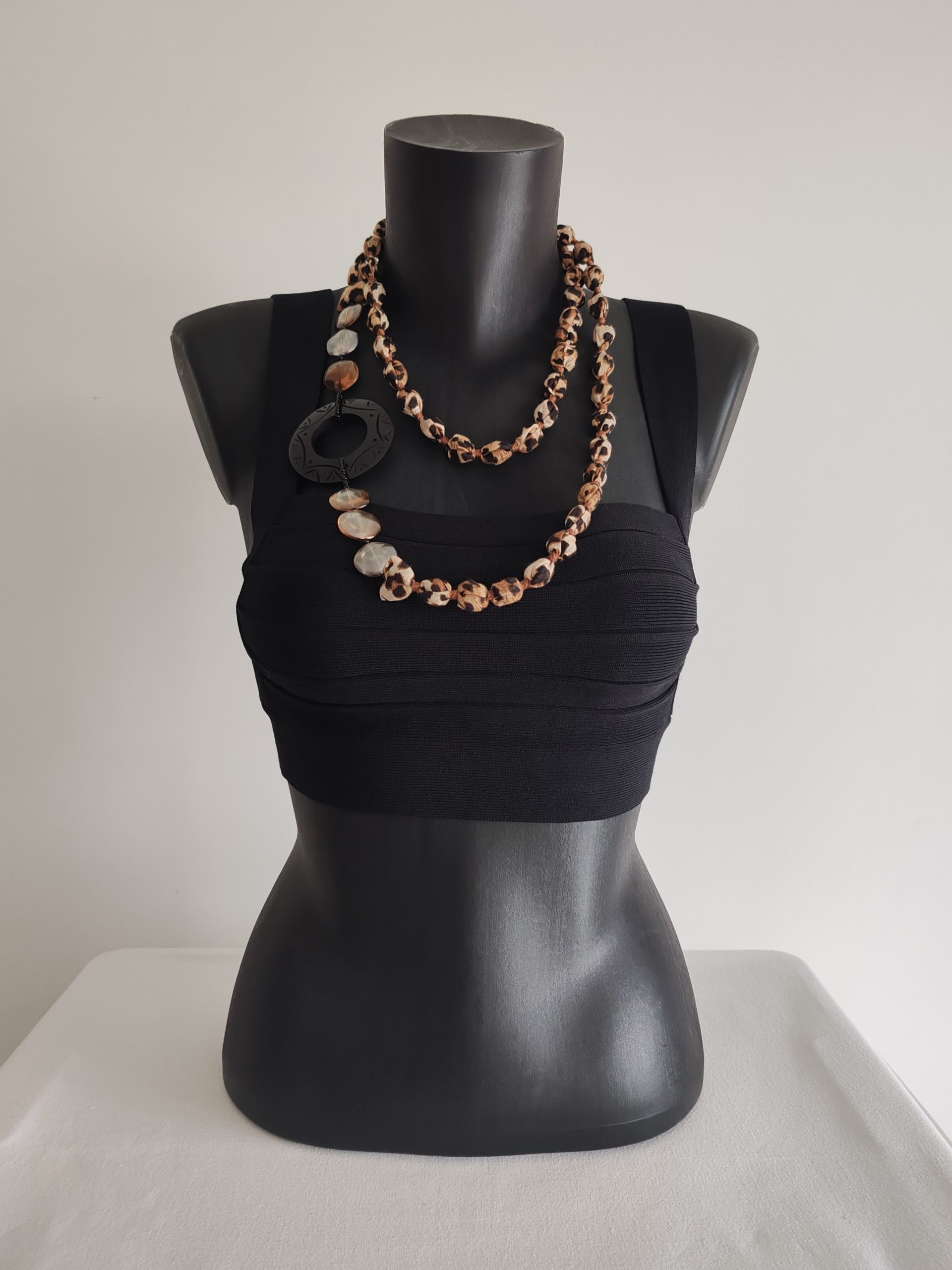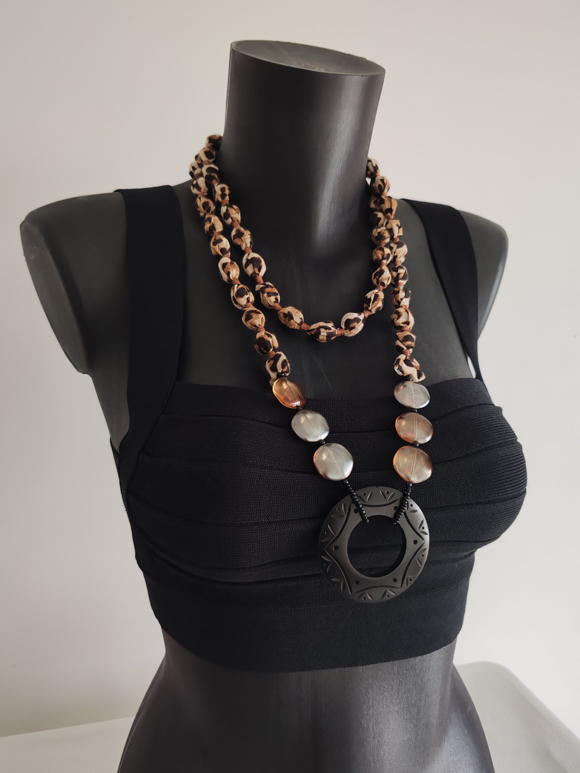 Un sautoir modulable réalisé en perles de coton motifs léopard associé à des perles plates en verre irisée couleur ambre et petites perles de rocaille noires et un pendentif en bois sculpté.