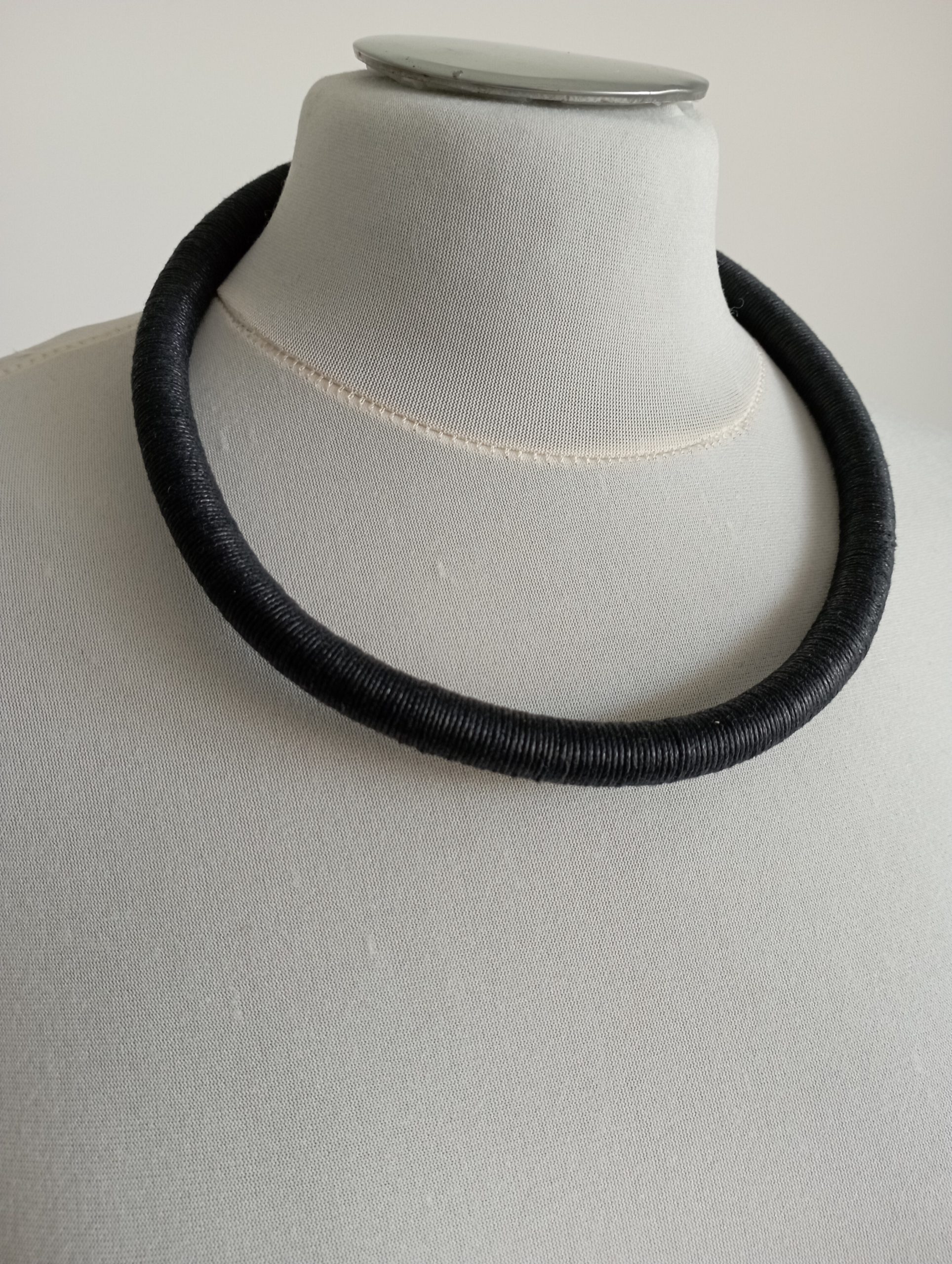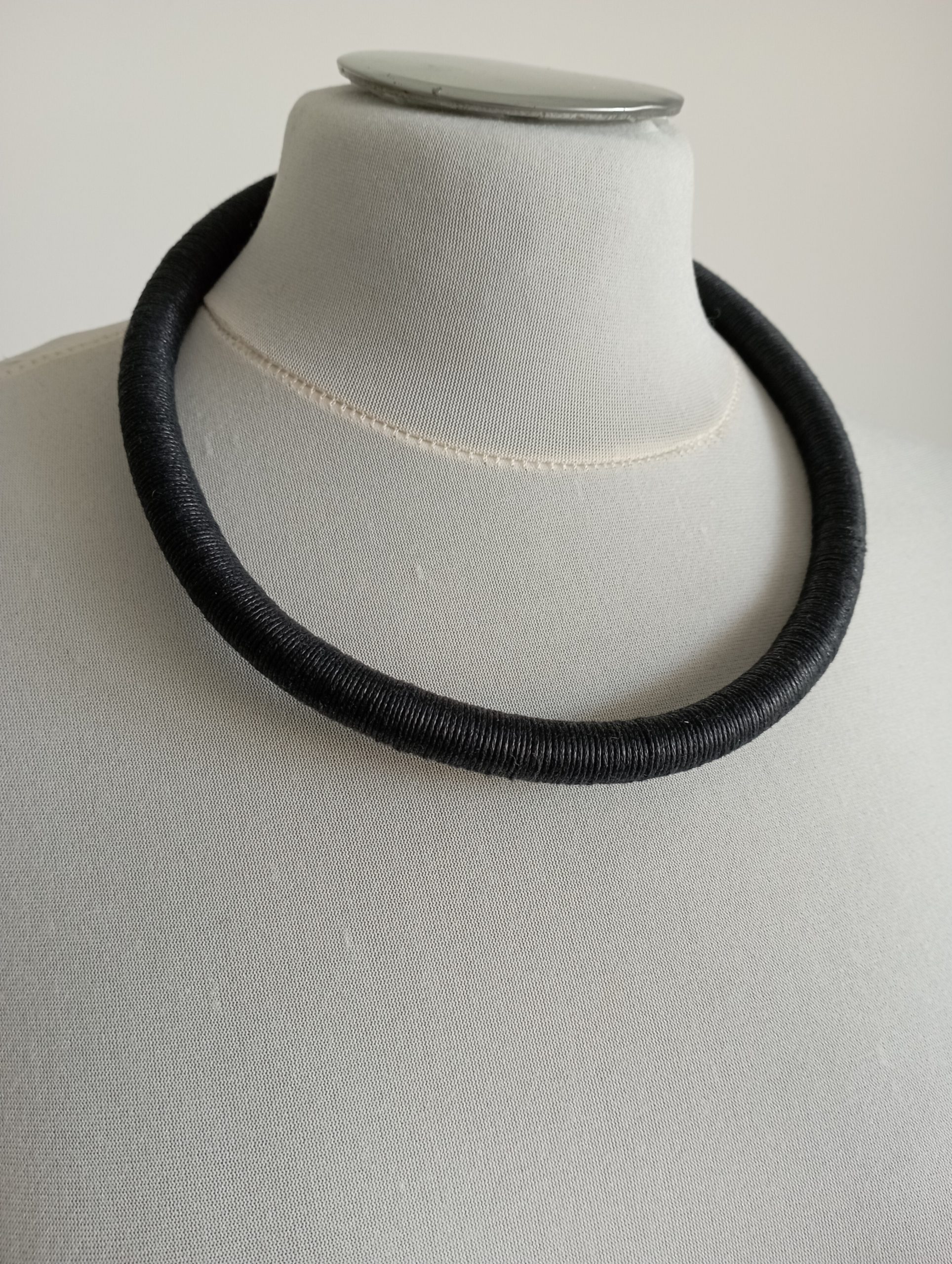 Collier tour de cou en polyuréthane entouré de fil de coton glacé noir. Ce collier se propose de se porter soit seul ou en superposé avec d’autres modèles de tour de cou ou encore comme base pour un pendentif… Ou les deux… Vous pouvez ainsi, composer votre collier du jour selon votre humeur, votre coup de coeur, vos envies… Ce tour de cou se ferme par une paire d’embout et un fermoir en laiton de couleur bronze