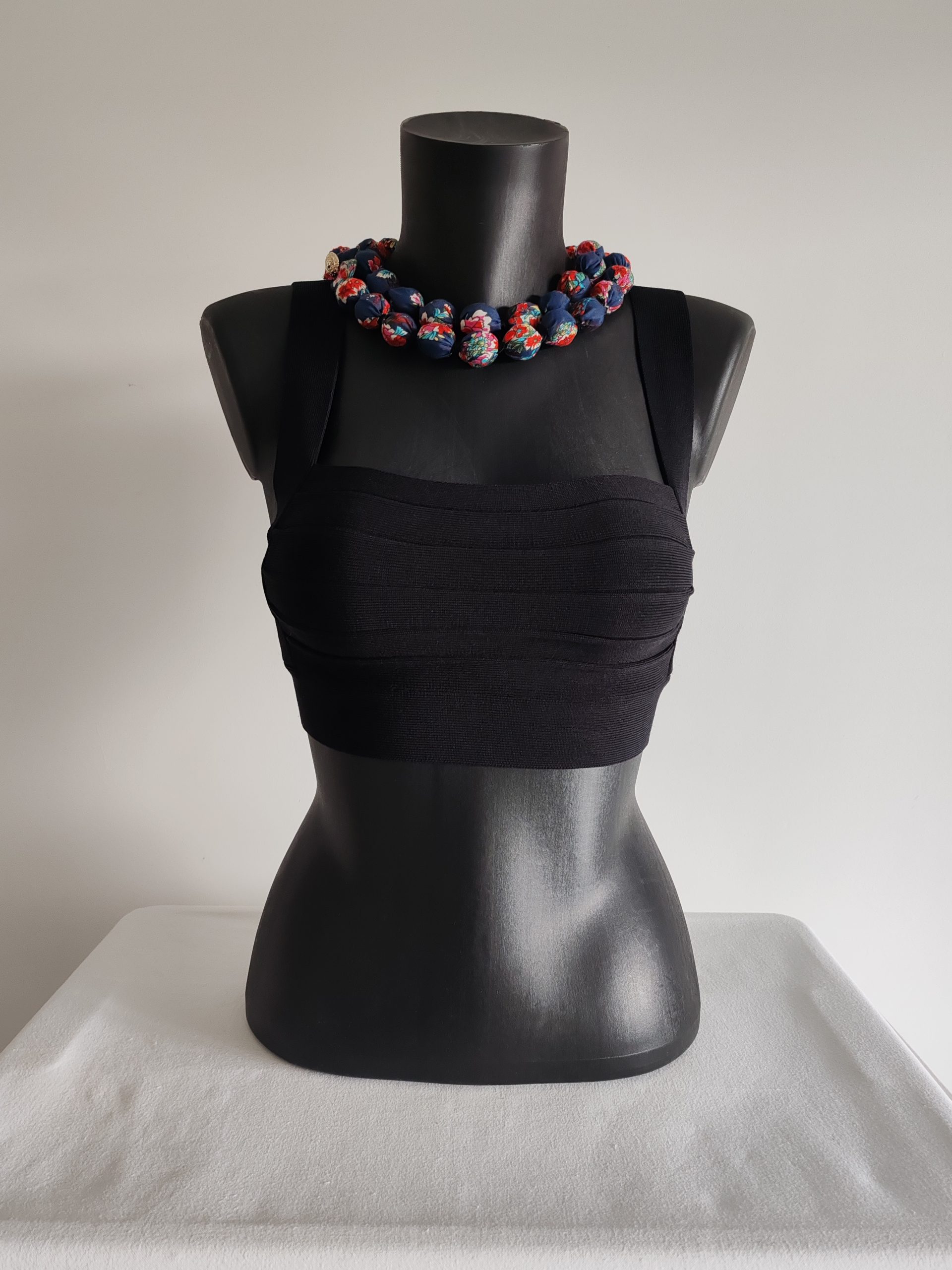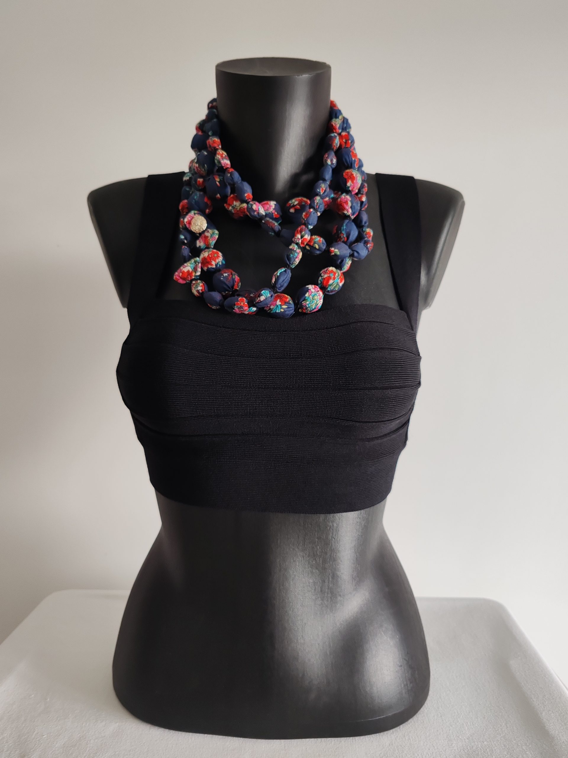 Elégant, léger et plein de fraîcheur, ce sautoir artisanal est réalisé à partir de perles de 2 cm de diamètre  enrobées d’un coton fleuri bleu marine imprimé de petites fleurs rouges, blanches et turquoises, pour un rendu délicat, vivant et très féminin.