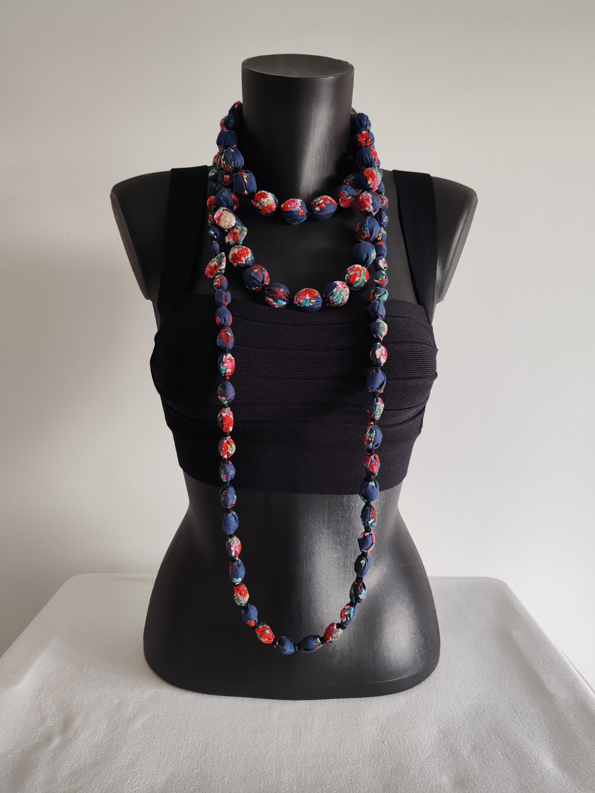 Un sautoir fait main avec des perles de 2 cm de diamètre, enrobées d’un voile de coton fleuri rouge, blanc et turquoise sur fond bleu marine, et fermé par un joli bouton décoratif en métal de couleur argenté. Un bijou léger et raffiné à porter au quotidien seul, ou en association avec d’autres.