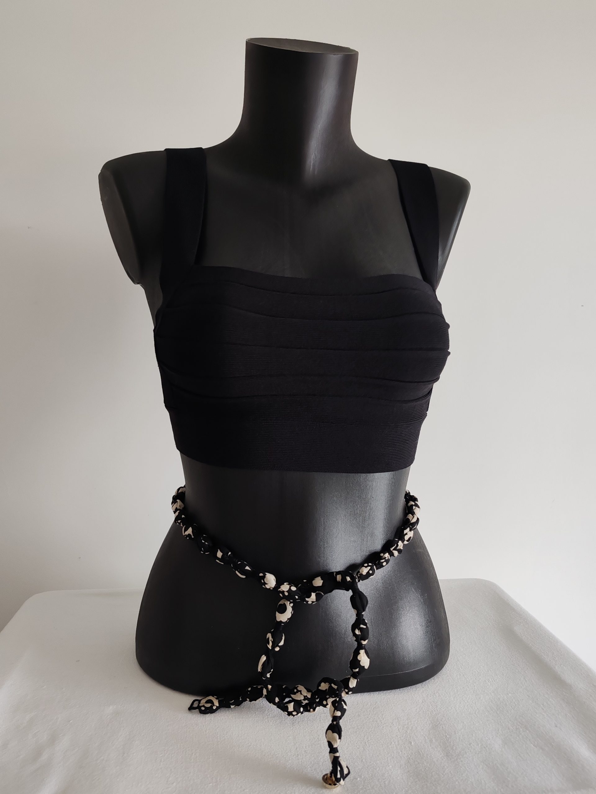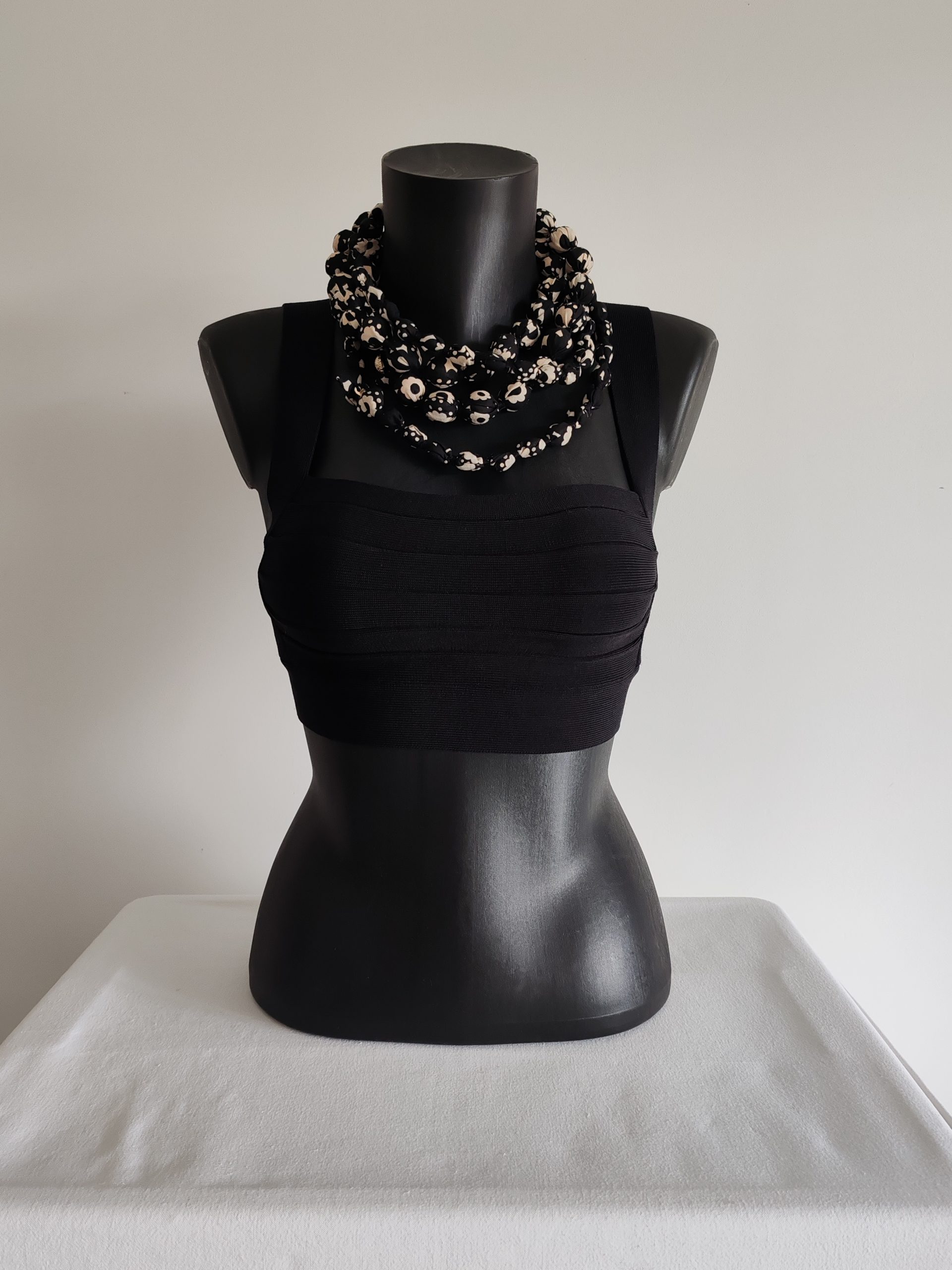 Un sautoir fait main avec des perles de 1 cm de diamètre, enrobées d’un voile de coton à fleurs stylisés sur fond noir, et fermé par un joli bouton décoratif en métal de couleur argenté. Un bijou léger et raffiné à porter au quotidien seul, ou en association avec d’autres sautoirs de même motifs et taille ou pas.