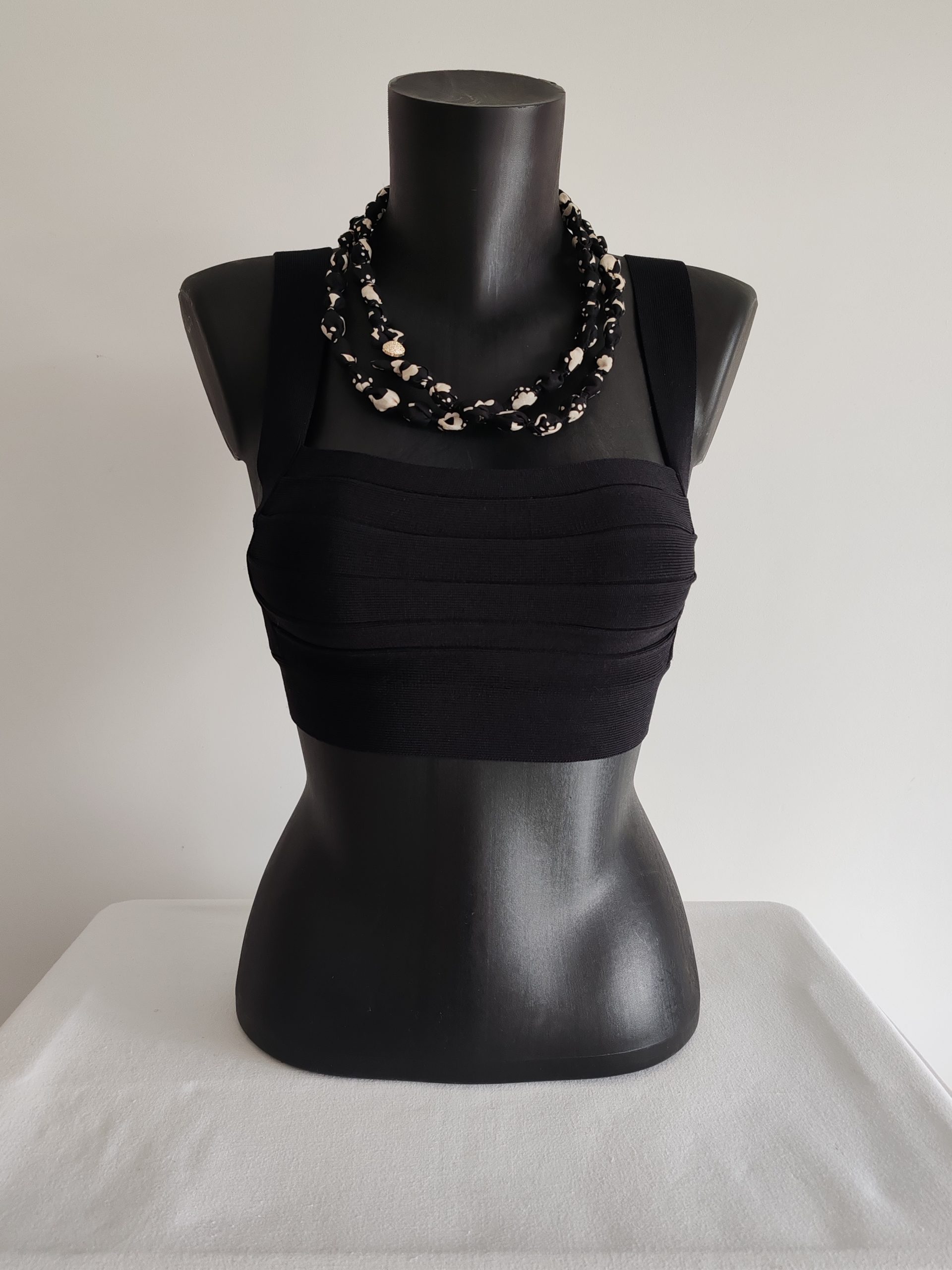 Sautoir Naïla – perles – S – de coton à fleurs stylisées blanches sur fond noir