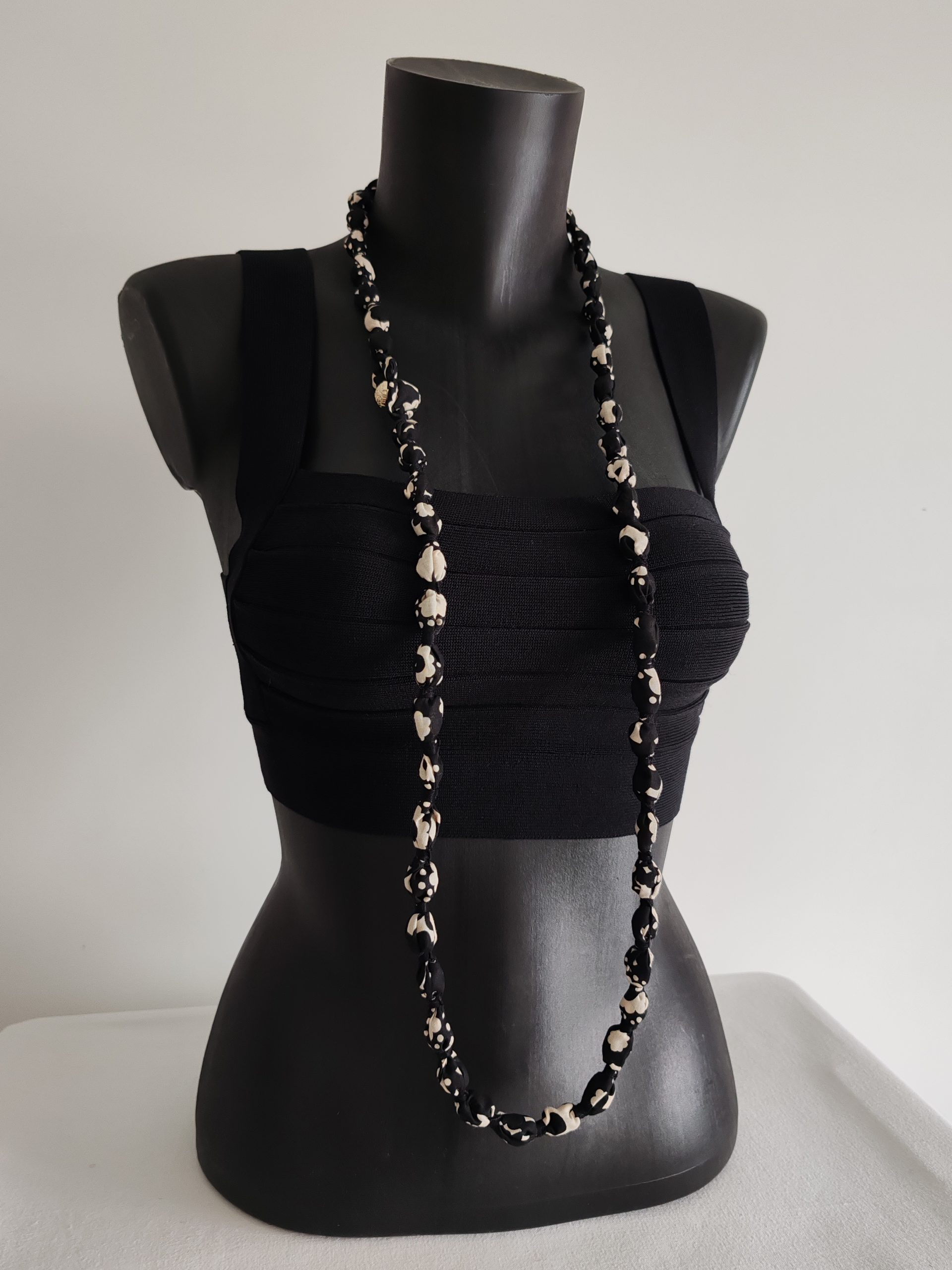 Elégant, léger et plein de fraîcheur, ce sautoir artisanal est réalisé à partir de perles de 1 cm de diamètre enrobées d’un coton imprimé de fleurs stylisés blanches sur fond noir, pour un rendu stylé, vivant et très féminin.