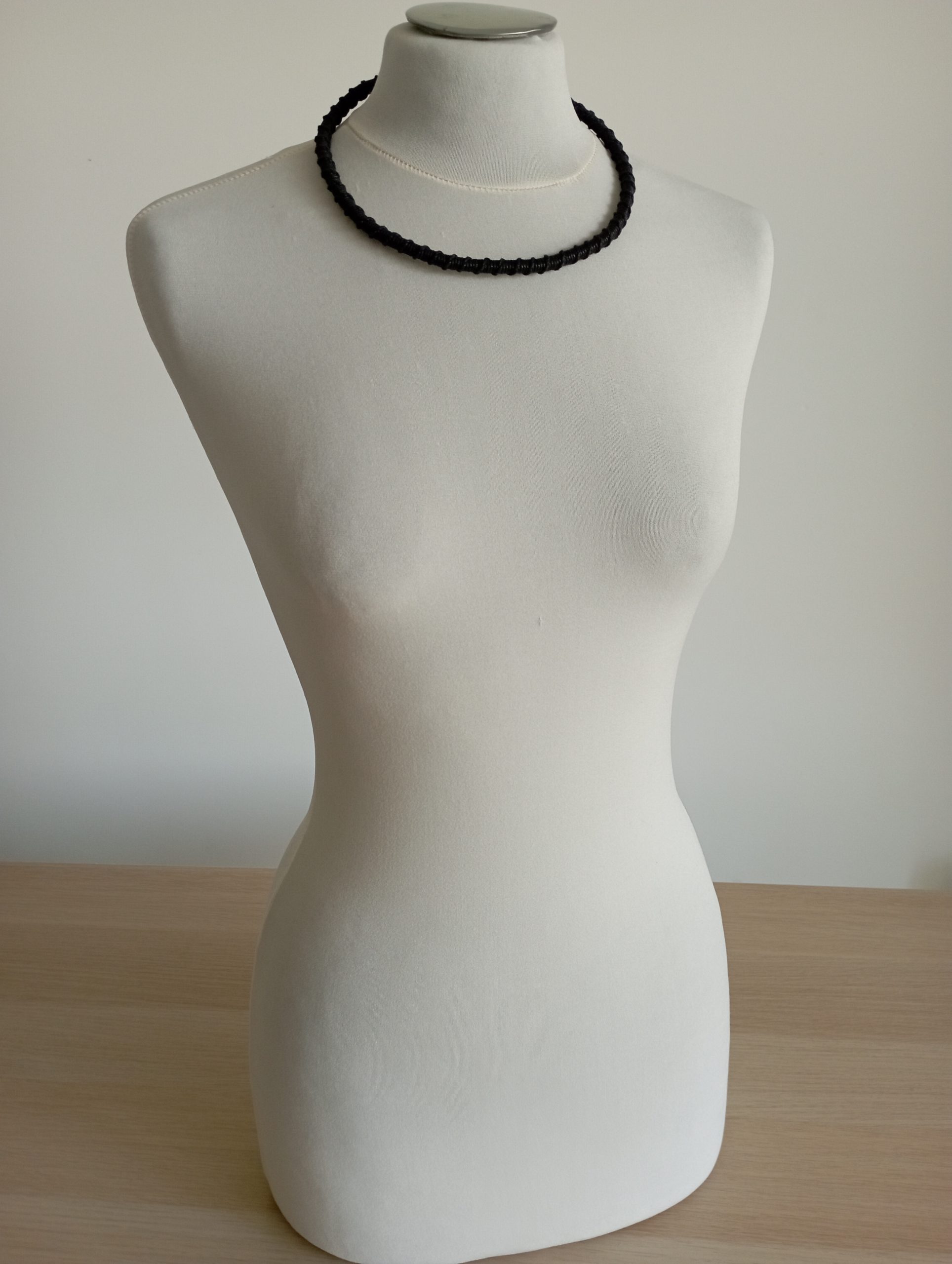 Ce tour de cou de la collection « Torsade » est réalisé en polyuréthane tressé à l’aide d’un fil de coton glacé de couleur noir. Il se ferme par une paire d’embouts et un fermoir en laiton de couleur bronze, et se porte soit seul, soit en association avec d’autres modèles de tours de cou, ou alors comme base pour un pendentif de la collection « Ewa »… Il peut également s’associer avec le sautoir corde « Eve »… A vous de composer votre bijoux selon vos souhaits, vos désirs et l’occasion.
